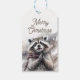 Juletiketter med en vacker tvättbjörn som tigger om några maträtter. Du kan ändra texten.