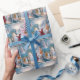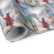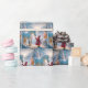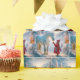 En liten flicka i en pulserande röd jacka och det är att utvidga ett rött äpple till en vacker häst i ett snöbergslandskap. Kan användas till julklapp.
