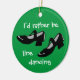 Den här visuella julprydnaden för dans-älskare har ett par svarta Mary Janes-dansskor på gröntens bakgrund. Det står att jag hellre vill vara linjedans. Du kan ändra detta i mallen för att anpassa det. Klicka på Anpassa om du vill ändra teckensnittet stil eller färg eller färg i bakgrunden. Det finns plats på baksidan för ditt meddelande, eller så kan du ta bort det för att lämna tillbaka tomt. Byt bara ut exempeltexten mot ord i mallen och lägg till en egen text för att anpassa. Det här är perfekt för linjedansare. Eller någon som bär Mary Janes dansskor. Hitta andra gåvor i Dancing-sektionen i Alinas penna. Ge en till din linjedansinstruktör.
