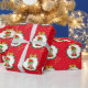 Klar julklapp som håller en presentlåda i mitten av en gräs-andedräkt med poinsettias, rött bollar och guldstjärnor på röd bakgrund Gift Wrapping Papper.