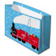 Personlig jul tåg i snö stora presentväska. Gör en fin julklapp till en ångande tåg eller en järnvänlig barnson, son, make eller pappa. I tecknaden tåg finns utrymme för mottagarens namn, året och ställe efter givarens val. Du kan ändra texten genom att klicka på personlig. Matchningskort och gåvor finns också i denna lokomotiv utformning.