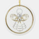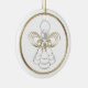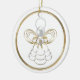 En grafisk jultema med en guld-filigree-ängel med pärlor som håller ett hjärta med budskapet "Joy" på vit bakgrund. Skriva ditt meddelande på baksidan av dekorationen.
