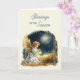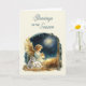 Det här serenjulkortet har en söt barnlik ängel före halmbädden, som lyfts upp av Betlehem i en fredlig natt himmel. Två lamm vilar i närheten, blickar mot den osedda mangaren, ger tyst vördnad och är . På framsidan står "Fredliga välsignelser av säsongen" som en vänlig och uppriktig känsla. Inuti finns ett varmt budskap till önskemål för kärlek, fred och välsignelse.