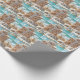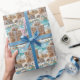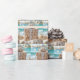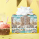 En vackert inslagen presentlåda med stjärnfisk och årstidsbundna dekorationer finns på en sandstrand, med en turkoshav och suddig ljus i bakgrunden