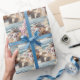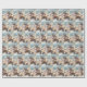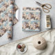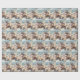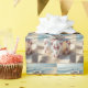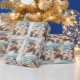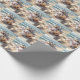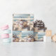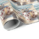 En vackert inlindad gåva med stjärnfisk mönster ligger i en strand med en mjuk vinkar hav i bakgrunden