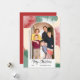 Det här julkortet har ett modernt välvt foto på en röd, grön och krämfärgad akvarellbakgrund. Foto © Storytree Studios, Stanford, CA