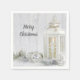 Vit julljus med prydnadsämnen och gräs i snö för en julfest. Text kan redigeras eller tas bort.