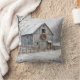 En rustik lada är försedd med en festlig julkrans mot en bakgrund av lätt fallande snö