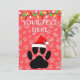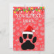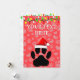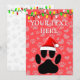Tecknad hundtavlor i svart. Tavlor och hjärtmönster i bakgrunden. Redigera texten för att anpassa. Tomt på baksidan för handskrivna meddelanden. Anpassade julinbjudningar. Röd tomteluva version med julbelysning. Gåva idé för hundälskare.