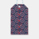 Dessa märkre för julklapp har en mönster av röda cyklar med candy cane rand på ram mot mörk blått bakgrund. Lägg till texten.