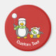 Lite penguin tecknad med snöboll och en blekt. Bägge på sig grönt scarfs och jultomter.