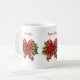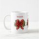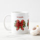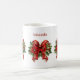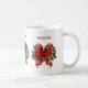 Ett mugg med en julklapp i rött och guld. Omgiven av poinsettiska blommor, gräs och Juldekorationer.