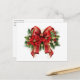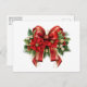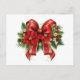 Ett vykort med en julklapp i rött och guld. Omgiven av poinsettiska blommor, gräs och Juldekorationer.