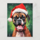 Färgrik och glädjefull juldesign med en tysk boxer som bär en tomtehatt.