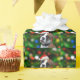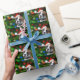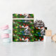 Hund med grå och vit boxare har en för liten julhatt och ser söt ut med ljus i hundälskarna och jultomten är papper och helgdag
