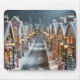 Snö hamnar försiktigt på en charmerande bygata som är klädd med gingerbrödhus förankrade med polkagrisar och festlig ljus