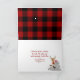 Gingerbrödhuset i snö med torn kant och buffalo plaid gräns