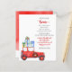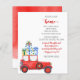 Budget Vintage julklappar på en röd bil Vi har flyttat Julflyttningsmeddelande Julkort med röd vintagebil och dekorerade julklappar ovanpå