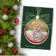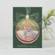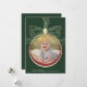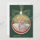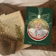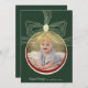 Den här eleganten har julkortet en klassisk bauble-design och en feg båge i guld mot en djup grönt med röda accenter tillsammans med en rund fotomall inuti bubblan. Perfekt för jul, familjefotor och helgdag.
