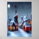 Julbyn på vintern på natten med snö på marken och hus och måne på himlar. Det här är en AI-skapad konst.