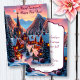 En vacker serenscen med ett julleskort för helgdag av personlig. På baksidan av kortet är ett ställe som du kan lägga till ditt eget personlig-meddelande. En söt, festlig liten by med festhus, ett vackert kyrkstäppel och snö täckte bergsbakgrunden.