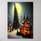 Julbyn på vintern på natten med snö på marken och hus och måne på himlar och ett stort Julgran. Det här är en AI-skapad konst.