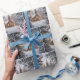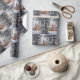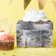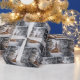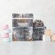Liten brun kyrka med ljusnande ljus på vintern med snöflingor och gräs träd