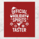 Offert: Officiell Helgdag Spirits Taster. Röd bakgrund, vit text. Dekorerade med glas av vin, julhatt, svanglas och snö kristaller.