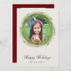 Vattenfärg vinter tall skog krans, "God Jul", platt semester fotokort på antika krämfärgad bakgrund. Baksidan av kortet har ett andra inramade foto på djupröd bakgrund med mall linjer för din egen text.