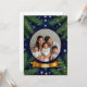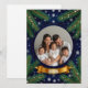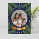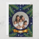 Cirkulär ram för högtider dekorerad med guldband, omgiven av städsegröna växter och snöflingor, perfekt för säsongsbetonade designer som julkort eller evenemangsinbjudningar.