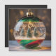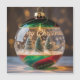 En detaljerad närbildsfoto av en elegant glaskulor till julgranen designad för att se ut som en miniatyr snöglob. Inuti den klara globen finns tre små julgranar av typen borstträd som ligger i vit konstsnö. Glasets utsida har dekorativa virvlar i djupröd och smaragdgrön färg, och orden "Merry Christmas" är skrivna med en vit kursiv stil tvärs över framsidan, tillsammans med små snöflingor. Bakgrunden är suddig med varma, gyllene bokeh-ljus, vilket ger en mjuk, magisk och festlig atmosfär.