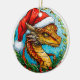En skarp och färglös illustration av en drake som bär en röd julhatt, försedd med vitt päls. Dronen har gyllene skalor och ett intensivt uttryck, omgivet av grönt gräs grenar och en blå bakgrund, ge den ett festligt och vismiskt utseende.