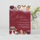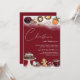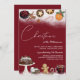 En inbjudan till julfesten party eller middagsfesten. På en feströd bakgrund med snö visas mat som mullat vin, malet paj, ingerbröd, julkaka och polkagrisar.