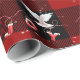 Vit duva med glädjskylt på röd och vit strimlad sträng i snöflingor på röd och svart buffel som ska vara klar till jul