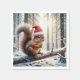 En ekorre som bär en julhatt är genomträngd på ett gren täckt av snö i en vinterskog, med solfiltrering genom träd