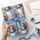 En ekorre som bär en julhatt är genomträngd på ett gren täckt av snö i en vinterskog, med solfiltrering genom träd