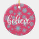 Rosa, gigantisk och söt. En liten julprydnad under jul med rosa Unicorn i en virrvarr av blå stjärnor som formar Julgran. Bakgrunden är rosa med olika former av snöflingor. Anpassa genom att ändra namn till din egen eller speciella gåva. "Tro" på ord är på baksidan, men detta kan tas bort av er. Ornament matchar en rad olika julklappar och anpassningsbar från rosa Unicorn.