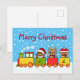 Alla ombord på det festliga jul-tåget. Med på resan är en söt pepparkaksgubbe, en glad ren och en potatis utklädd till tomte. Det finns en vinterbakgrund med fallande vita snöflingor.