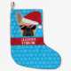 Modern illustration i stil av en ljussken/gräddvit fransk bulldog med en röd julhatt och solglasögon. Jultematfrenchie placeras på en blå bakgrund med en vit snöflinga mönster och det finns utrymme för att lägga till er egen formulering. Det finns också olika bulldog-versioner för fransk av färgad.
