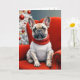 En Fransk Bulldog med en röd halsduk och t-shirt sitter på en rödröd stol bredvid ett dekorerat vitt Julgran med röda prydnadsföremål