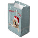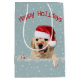 Kute, guldladdare med läppstift kyssar och julhatt på snöflingbakgrunden och silver-tinsel. Text kan redigeras.