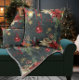 En lyxig och festlig vinterdesign för jul med en mörk grönt vinterbakgrund för skogarna med skakande snöflingor, vattenfärgade poinsetter, en glödande helgdag, gräs-koner och röda bär med en strålande röd boll-ornament på rött band som faller på denna mysiga vintertäckfilt.