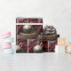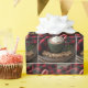 En mysigt scen har en brinnande mugg av hett choklad med pipad grädde och en candy cane mot en röd och svart baksida av buffelflanalettfiltar