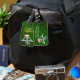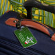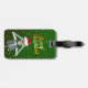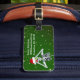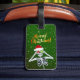 Den här bagagetaggen är grönt med guld-stjärnor och en roligt jul-skelett med en röd Santa Hat med päls-trim som håller upp blanka prydnadsföremål till ögon. God jul-texten visas på baksidan och du kan anpassa ditt namn och adress på framsidan med mallen.