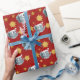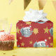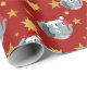 Papper julomslutning med en illustration av en söt elefant med rött tomteskal; underbar dekoration för helgdagar till jul, med röd bakgrund med stjärnor, illustrerad av Radka Kavalcova
