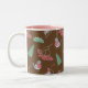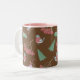 Ett sött julkaffe mugg med ett mönster av vinterfåglar i sötare, Julgranar, grovt löv, röda hollbär och slips med presenter på brunt underlag för att lägga till en helgdag som designer i ditt hem för helgdagarna.