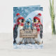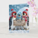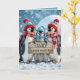 Tre penguiner står tillsammans i snö och bär lekfulla vinterhattar och scarfar medan de håller ett rustiskt träskylt med roligt text. Inre text kan redigeras.