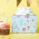 Papper julomslutning som dekoreras med en mönster av vattenfärgade julföremål i blått, gult och rött mot blå bakgrund. Man hittar träd, krukor, godis, stjärnor, strumpor, löv och bär på en festlig arrangemang.