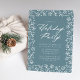 Enkel inbjudan till julfest och elegant med gräns i vitt snöflingor och gräs grenar på en frostig blå bakgrund. "Julfest" visas i ett fet, vitt kalligrafiskript med information om party som visas nedan. Julfesten inbjudan, snöflingan, återgår till visningen av ett vackert snöflinga mönster.