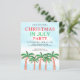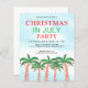 Denna budget julfest i juli inbjudan är dekorerad med en akvarell blå himmel, palmer med lampor och kulor.
